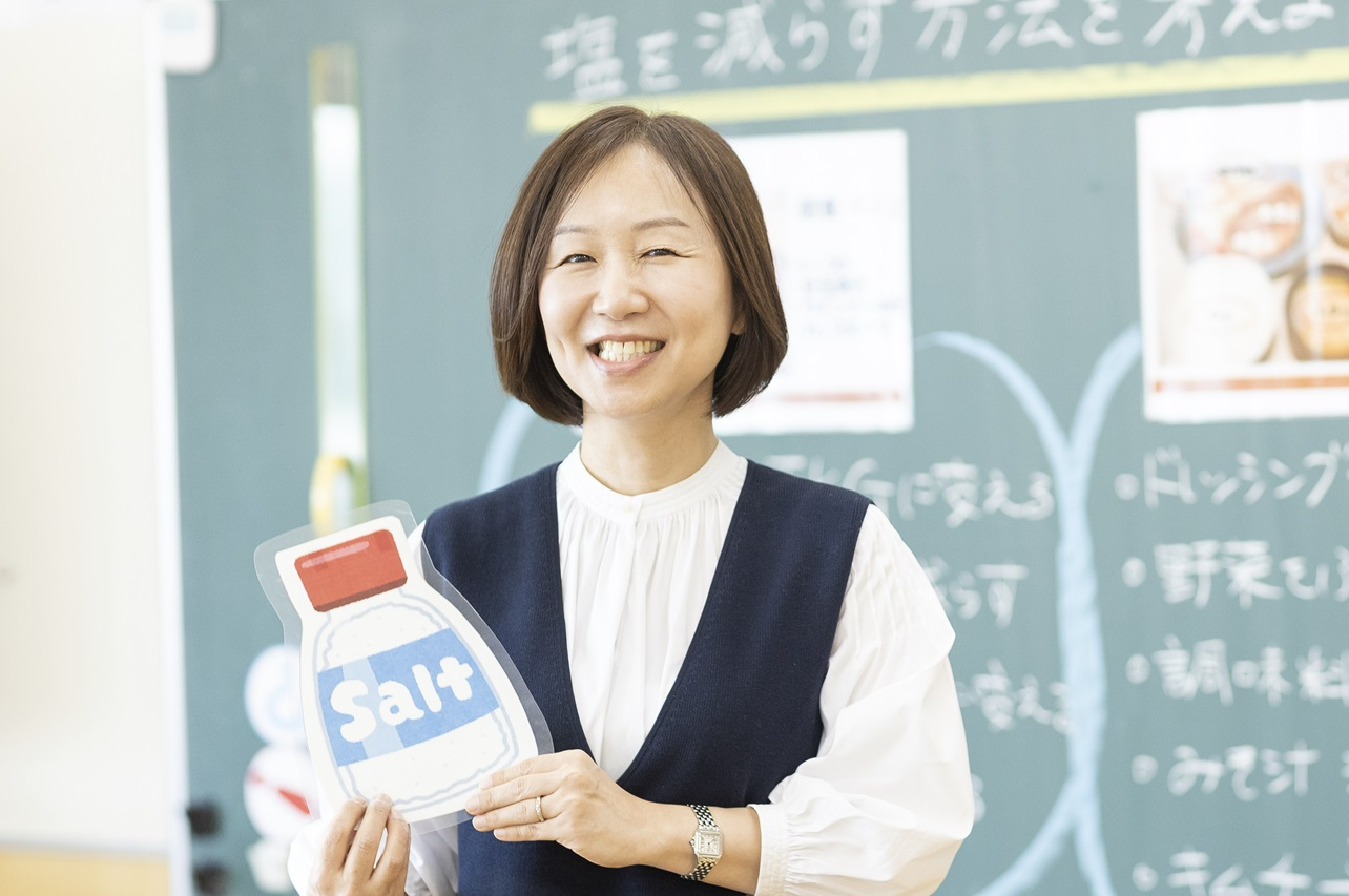 取材に訪れた日は6年生のクラスで「適塩のすすめ」と題した食育授業が行われていました。食塩は身体に必要だが、摂り過ぎると良くないことを食品に含まれる食塩量を例に挙げて説明すると、児童たちは「摂り過ぎると生活習慣病の原因になるんだ」等、声を上げて反応していました。