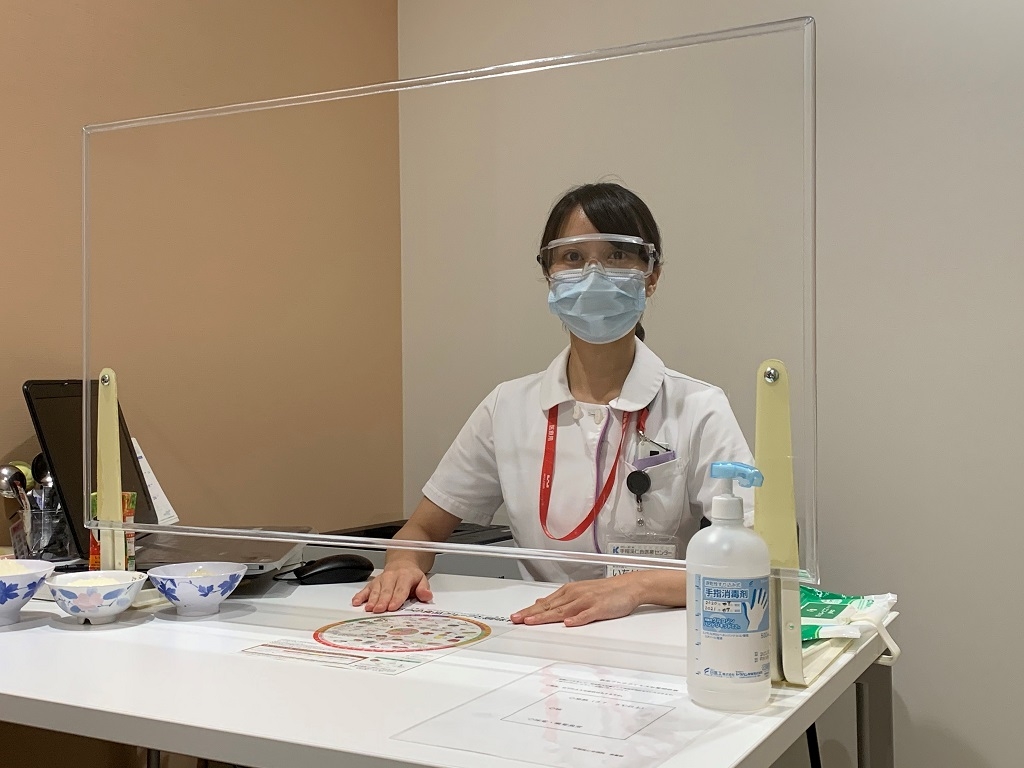 田中さんは、密室になりがちな栄養指導室の一部を改装しました。これまではプライバシーの保護のために、栄養指導中は部屋の扉を閉めて使用していましたが、密閉しないようにロールカーテンを設置しました。また、患者さんと対面するテーブルにはアクリル板を置き、管理栄養士はマスクの着用と合わせて飛沫を防ぐゴーグルをかけることにしました。