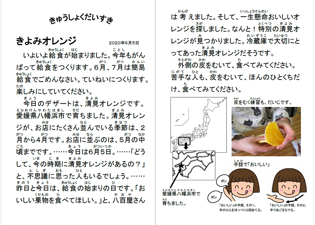 「今日のデザートは、清見オレンジです。清見オレンジがお店にたくさん並んでいる季節は2月から4月です。どうして、今の時期に清見オレンジがあるの? と不思議に思った人もいるでしょう。昨日と今日は給食の始まりの日です。『おいしい果物を食べてほしい』と、八百屋さんは考えました。そして、一生懸命おいしいオレンジを探しました。なんと!特別の清見オレンジが見つかりました。(産地の)冷蔵庫で大切にとってあった清見オレンジだそうです。」(一部略)