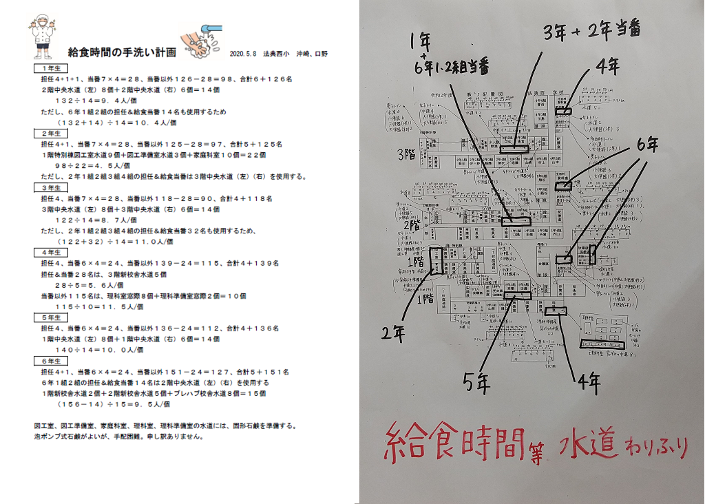 そこで口野さんは、図工室や家庭科室などの特別教室の水道も使うことを考え、どのクラスが家庭科室に行くと短時間で手洗いを完了できるかを、実際に廊下を歩いて時間を計測しました。そうして、「給食時間の手洗い計画」を学年ごとにまとめました。具体的には、