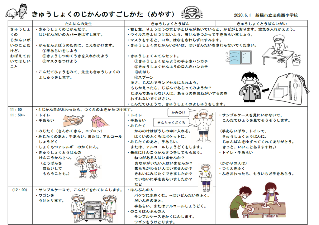 また、安全に給食を運営するために、口野さんは配膳や片付けについても、担任に意見を聞きながら、短い時間で「密」な状態を作らずに子どもたちが行動できる方法を考えました。従来は教室内で3つ連続して並べていた配膳台を、それぞれ離れた場所に置くなど担任ならではのアイデアも出てきました。担任と給食当番の児童、当番以外の児童、それぞれの「きゅうしょくのじかんのすごしかた」を、4時間目終了後から昼休み前まで時系列の表にして、クラスに掲示するとともに、食育だよりに掲載し、全児童に配付しました。