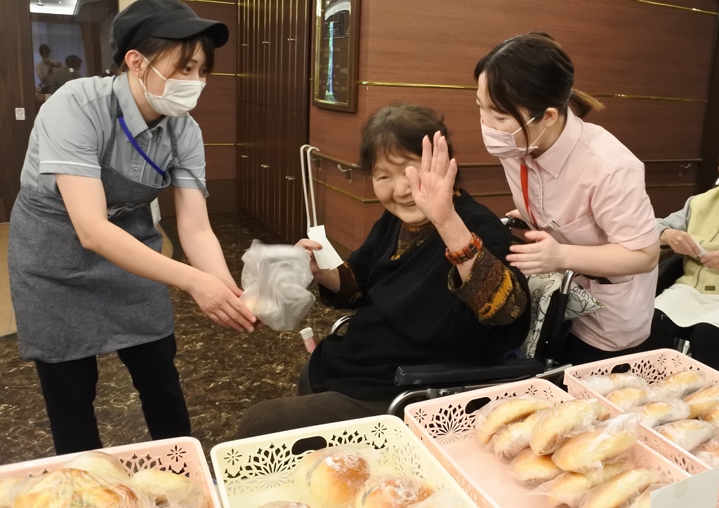 毎年7月に開催している納涼祭は、家族も招待し、模擬店や職員の出し物などで盛り上がりますが、今年は「ミニミニ納涼祭」と題して、ユニットですいか割りや輪投げなどをして盛り上がりました。8月に行っている流しそうめんも1レーンに1人ずつ並んでもらい、少しずつ楽しんでもらうようにしました。また、少しでも外出した気分を味わえるようにと、ケーキバイキングを実施しておやつを自由に選んでもらったり、パン屋から仕入れた多種類のパンをユニットに並べて「パン屋さん」を開店したり。一人ひとりの間隔をあけてのカラオケ大会も行いました。また、日々の食事やおやつでも、季節感や日本の行事を感じられるよう工夫をされています。