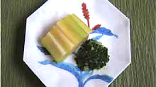 湯を沸かし、茎を入れ、再沸騰したらすぐに細いものから冷水に引き上げる。残り湯に塩を入れて、葉を青茹でする。 |