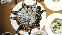 家庭菜園で収穫した長卵形のなすを使いました。さっぱりいただける一品です。色が引き立ち、お酒の肴やオードブルとして、ぜひどうぞ。