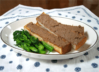 食パンは縦に4等分してスティック状にし、トースターできつね色に焼き、レバーペーストを塗って食べます。 |