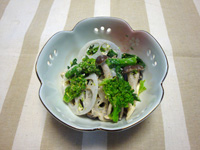 ボウルに菜の花とれんこん、ぶなしめじを入れ、マヨネーズ、すりごま、こいくちしょうゆを加えて和える。 |