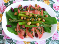 アスパラガス、トマト、ミックスビーンズを盛りつけてパセリソースをかけていただきます。 |