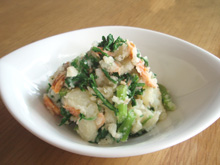 定番のポテトサラダに春菊と焼き鮭を入れた、ご飯にもパンにも合う一品です!