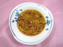 生の菊のない時は、干し菊で作ります。 また、生の菊がたくさんある時は、酢を入れた湯で茹で、水にとり絞って、冷凍保存しておきます。酢を入れて茹でると、菊が色よく仕上がります。