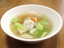 鍋にオリーブ油を熱し、A@の順に入れて炒め、全体に油がまわったら、水、コンソメを加える。煮立ったら火を弱め、5〜6分煮、里芋がやわらかくなっていたら塩で調味する。 |