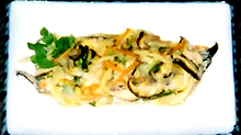 200℃に温めたオーブンレンジで、野菜と卵黄に焦げ目がつく程度(約10分)に焼く。 |