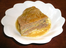 鍋に固形コンソメ・水・しょうゆを入れる。弱火で固形コンソメを溶かしたら、白菜→ハンバーグの生地→白菜→ハンバーグの生地→白菜の順に重ねる。落とし蓋をして弱火のまま約15分煮込む。 |