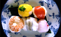 米は1割増しの水、酒、昆布を加えて炊き、酢(A)を混ぜて寿司飯を作る。25個〜30個に丸く、軽く握っておく。 |