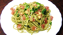 スピナッチスパゲッティは、塩を入れたたっぷりの熱湯にばらしながら入れ、表示時間通りに茹でる。 |