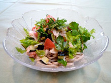 ボウルにオリーブ油、食塩、砂糖、米酢、すりおろしたにんにく、こしょうを入れ、よく混ぜ合わせ、@Aの野菜、ツナ缶詰を和えます。 |