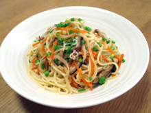 フライパンにオリーブ油、にんにく、赤とうがらしを入れて火にかけ、香りがたってきたら、生しいたけ、切干し大根、にんじんを入れて炒める。全体に油がまわったら、しらす干しを入れ、切干し大根のもどし汁(大さじ6くらい)を入れて蓋をし、1〜2分蒸し炒めにし、塩、しょうゆで調味する。茹で上がったスパゲッティを入れて、さっと炒め合わせ、器に盛る。 |
