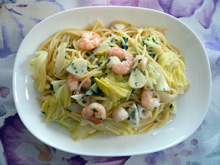 Cのソースに、@のスパゲッティとキャベツをからめる。 |