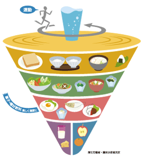 「食事バランスガイド」は、望ましい食生活についてのメッセージを示した「食生活指針」を具体的な行動に結びつけるものとして、1日に「何を」「どれだけ」食べたらよいかの目安を分かりやすく料理やイラストで示したものです。