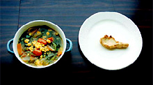 鍋にコンソメを水で煮溶かしたスープを入れ、ウインナーと野菜を入れて煮る。 |