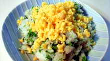 溶き卵にだしを加え、いり卵を作る。ぽろぽろのそぼろ状になるまで炒る。6 の菜の花ごはんのうえに散らして出来上がり。 |