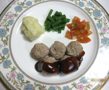 ミートボールと付け合せを皿に盛り、あんをかける。 |