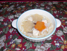 出し汁を入れて煮立ったらアクを取り、しょうゆ、塩で味付けをする。 |