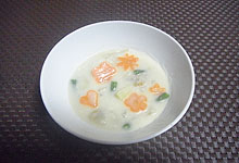 @が沸騰したらあくを取り、固形コンソメで味を付ける。 |