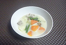 鍋に油を熱し大きめに切った肉を炒め、次に大きめの乱切りにした、たまねぎ、にんじん、じゃがいもを炒め、油がまわったら分量の水を鍋に入れ火にかける。 |