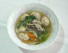水(出し汁)を沸騰させ、しょうゆ、塩で調味し、にんじん、しいたけ、はくさいの茎を入れ、肉だんごを丸めて加える。アクを取りながら煮る。しめじ、えのきたけ、はくさいの葉を加え、味を調える。 |