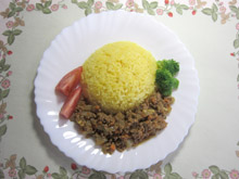 器にターメリックライスとドライカレーを盛り、トマト、小房に分けて茹でたブロッコリーを添える。 |