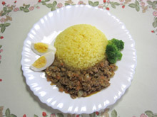 器にターメリックライスとドライカレーを盛り、卵、トマト、小房に分けて茹でたブロッコリーを添える。 |