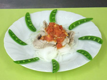 皿に水気を切ったたまねぎを盛り、その上に茹でた豚肉をのせる。上からCのソースをかけ、まわりに2つに分けたスナップえんどうを飾る。 |
