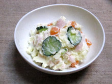 じゃがいもが冷めたら、きゅうり、にんじん、たまねぎ、ハムを加えて、マヨネーズで和える。最後に塩、こしょうで味を調える。 |