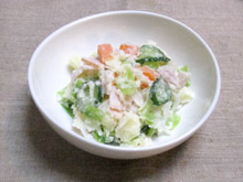 じゃがいもが冷めたら、きゅうり、にんじん、たまねぎ、ハムを加えて、マヨネーズ、酢、薄口しょうゆで和える。最後に、こしょうで味を調える。 |
