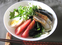 かぼちゃは薄く4等分にする。なすは縦半分にしてから、4等分にする。わかめは水に戻す。焼きちくわは縦半分に切る。トマトはくし形に、4等分にする。かいわれは根元を切り、半分の長さに切る。根しょうがはおろしておく。 |