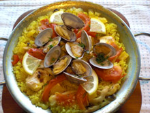 Bのフライパンに米を入れ炒め、全体に油がまわったら、コンソメスープ、あさりの煮汁、カレー粉を加え、煮立ったらBの材料をのせて蓋をし、弱火で20分程蒸し煮する。 |