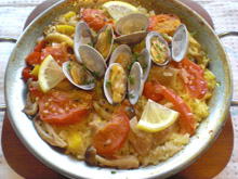 残りのオリーブオイルを足し米を入れて炒め、全体に油がまわったらコンソメスープ、あさりの煮汁、カレー粉を加え、煮立ったらBの材料を上にのせて蓋をし、弱火で20分程蒸し煮する。 |