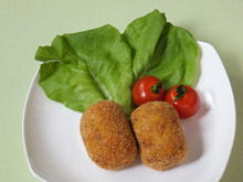 皿にコロッケを盛り付け、サラダ菜、ミニトマトを添える。 |
