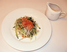 野菜は全て千切りにして、さっと茹でておく。 長ひじきは水で戻して茹で、食べやすい長さに切る。サーモンは一口大に切る。 |