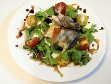 付け合わせ野菜を添えて盛り付け、ソースをかける。 |