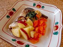 器に、さば、さつまいも、にんじん、しいたけを並べ約15分蒸す。さらにみつ葉を加えて火を止める。 |