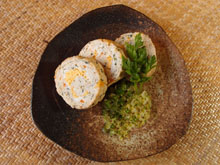 アルミホイル(25cm×30cm)にサラダ油(分量外)を薄くぬり、Aを15p×20pの大きさに広げる。卵の白身を全体に敷き、さらに黄身を全体敷き、巻きずしの要領で巻き、アルミホイルに包み込む。 |