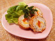 アルミホイル(25cm×25cm)にサラダ油(分量外)を薄くぬり、Aを15p×10pの大きさに広げる。卵の白身を全体に敷き、さらに黄身を敷く。にんじんを中央に置き、巻きずしの要領で巻き、アルミホイルに包み込む。 |