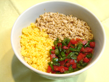 丼にごはんを平らに盛り、鶏そぼろ、卵そぼろ、野菜そぼろを盛り付ける。 |