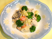材料が軟らかくなったら、ホワイトソースを加え適当な硬さまでに煮詰める。 |
