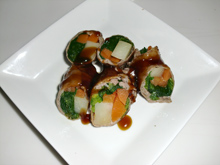 熱したフライパンに油をしき、肉の巻き終わりを下にして焼き、火が通ってきたら箸で回転させながら、全体をこんがりと焼き上げる。 |