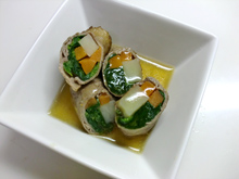 フライパンに出し汁、酒、みりん、しょうゆを入れて、焼いた肉巻きを煮る。最後に水溶き片栗粉でとろみをつける。 |