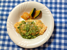 鮭の臭みをとるため、余分な水分をクッキングペーパーでふき取り、オリーブオイルで少し焦げ目がつく程度に両面を焼く。 |