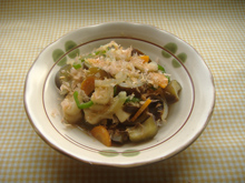 鍋を熱して油を入れ、水気を切ったなすを炒める。全体に油が回ったらにんじん、たまねぎを加えて炒める。次に出し汁、はんぺんを加えてふたをして10分程弱火で煮る。 |