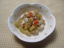 鍋に油とにんじんと豚肉を入れて火にかけ、全体に油が回ったら、出し汁と水気を切ったなすを加えてじっくり煮る。 |